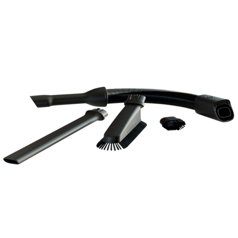 適合清潔家中與車上狹縫死角,配件組包含高彈性伸縮軟管、扁平長狹縫吸頭、軟毛刷與小毛刷。